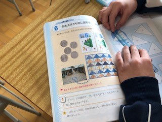 総復習として、『合同』の問題に取り組んでいました。コンパスや定規を使い、合同な図形などを書き取るのが苦手なようで少し険しい表情ではいましたが、一生懸命取り組んでいました。