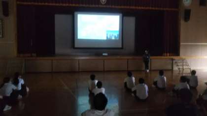 あいにくの天気だったため、体育館に集合して防災学習を行いました。