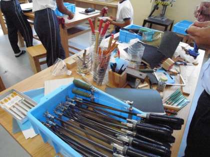 写真は3年生の技術の授業風景です。金属を加工しています。金属を削る音が教室中に響いています。