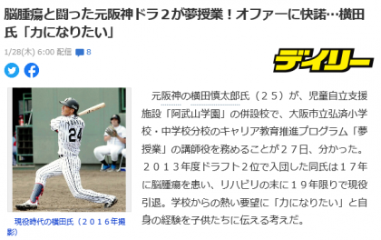 元阪神タイガースの横田慎太郎さんの夢授業の件が新聞だけではなく、yahooニュースにも掲載されています。