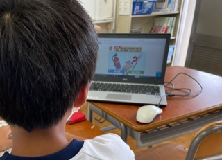 今日は、児童から防災に関するクイズをポスターに書きたいと意見が出たため、パソコンを利用し自分で調べてクイズを記入していました。