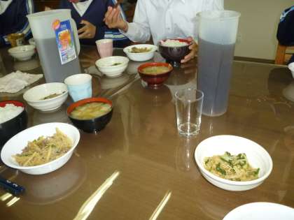 毎週水曜日、分校の職員が寮にお邪魔して、一緒に昼食をいただきます。食事の量は、児童・生徒サイズですので、寮によっては、かなりの大盛りになります。初め、特に女性の職員はその量にびっくりしますが、とてもおいしいので残さず食べれてしまいます。毎週、各寮をまわれるので、普段、授業を担当していない児童・生徒とも話をする機会にもなっています。ちなみに、今日の料理は「牛肉時雨煮」IN 山吹寮!とにかく、子どもたちはよく食べます!