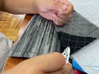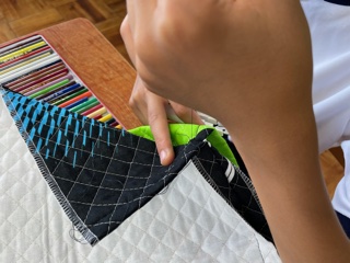 今回は、ミシンを使ってナップザックのあけ口部分を縫いました。