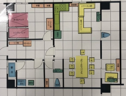 写真は中学2年生家庭科の授業で行った平面計画です。