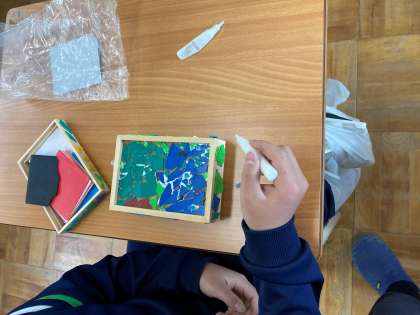木でできた「オルゴール箱」に、プラモザイクを張り付けていきます。
