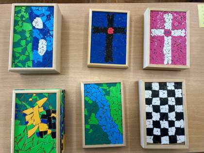 本日の小学部図画工作科の授業風景です。以前から取り組んでいる「オルゴール箱作り」が本日完成しました。