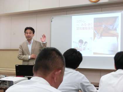 児童・生徒に対するトレーニングに引き続き、放課後に宮口先生を講師として教職員向けの研修会も行われました。今回は認知トレーニングの中でも宮口先生の考案された『コグトレ』について研修し、日常生活や学級活動での実践方法やその効果など、様々な内容を学ぶことができました。