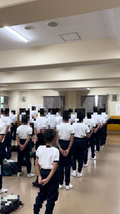 今日の写真は朝礼の始めに行っている学園歌を歌っているようすです。朝から大きな歌声が響いていました。