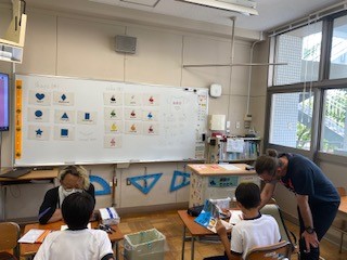 今日は色と形について、ゲームをしながら発音と意味を覚えました。最後に、Tシャツの紙に好きな形を描き、色で塗るというオリジナルデザインを作りました。そして、児童達は英語で説明しながら自身の作品を発表しました。