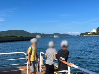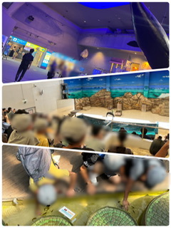 朝早くからたくさんの先生方に見送って頂きました。電車を乗り継ぎ、まずは水族館で昼食を済ませてショーや展示を見学しました。その後、遊覧船に乗りました。