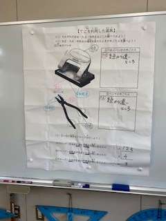 今日は身の回りのもので、てこを利用した道具を調べました。調べたものは、クリップ・はさみ・トング・穴あけパンチ・ペンチです。それぞれの支点・力点・作用点はどこか、どのように使用すれば小さな力で利用できるかを実際に使って確認しました。子どもたちは、3点の位置が道具によって異なることに気付いていました。他にも身の回りのもので、てこを利用した道具がないかを考えていました。