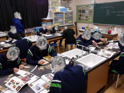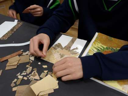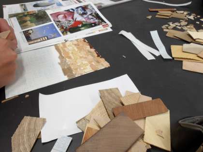 薄い木材をちぎって両面テープの上に張り付けながら、有名な絵画の模写をします。それぞれの木材の明度を生かして作品を作るのですが、繊細な作業なのでみんな真剣に取り組んでいます。