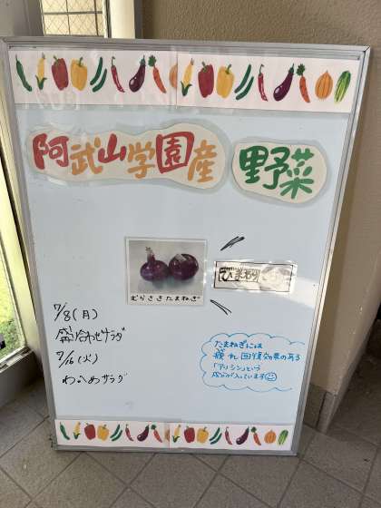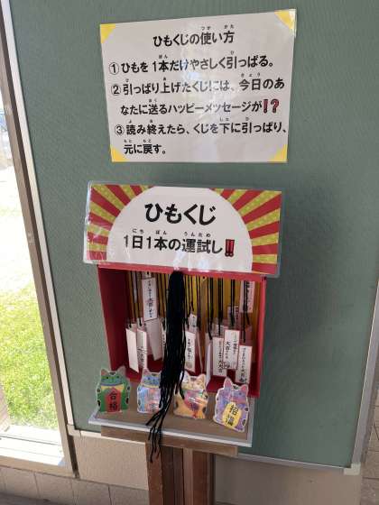 写真は管理栄養士さんが作って下さる、子どもたちが作った野菜を使用したメニュー表。養護教諭が作成した前向きな気分になれるおみくじです。どちらも子どもたちがよく通る廊下に設置しており、目を引きます。