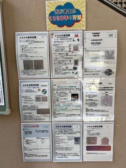 事前・事後の学習で万博について調べたり、考えたりして、理解を深める活動を実施しました。その活動のひとつとして、「2050年の万博」についてクラスで考え、まとめました。