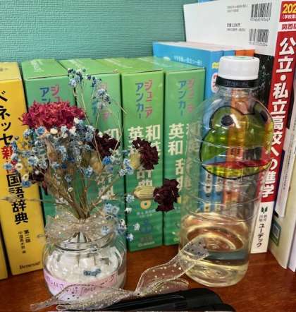 合わせて、消臭効果が期待できる重曹を空き瓶にいれたものも設置しました。(写真左)以前の学校行事で使用したお花のドライフラワーも添えて、華やかな空間になりました。