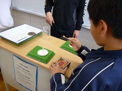 火を使う実験なので、安全には特に配慮して行いました。マッチに火を付ける時は少し緊張している様子でしたが、意欲的に取り組むことができました。