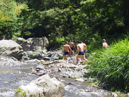 摂津峡に到着してからは、河原でカレーを作って食べたり川遊びをしたりと、大自然を満喫しました。川の水はまだまだ冷たかったですが、子どもたちは普段見せない無邪気な表情を見せて楽しんでいました。先生方もマイナスイオンを体いっぱいに浴びて、日頃の疲れを癒していました。