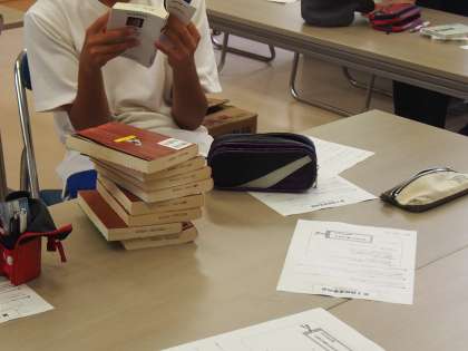 図書室の中にある本から名言を選び、その名言と本のタイトルを書いたものを「しおり」にする。