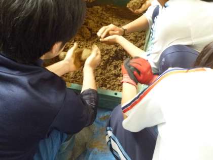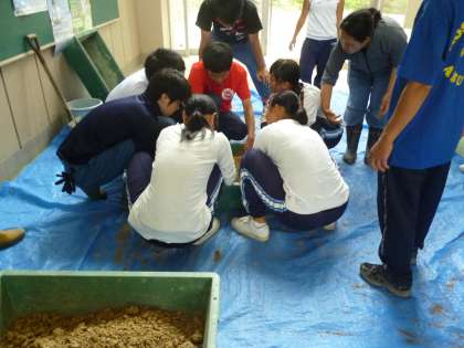 雨模様だったので、校内のピロティで行いました。材料には、保健委員の作ってくれたEM発酵液と、男子寮が作ったEMぼかしを使いました。土には小さな石がたくさん混ざっているので、ふるいにかけて発酵液やぼかしがダマにならないように手でよく混ぜました。ぬか漬けのような発酵液の臭いも、途中から気にならなくなり、米ぬかやEMの感触の良さに楽しそうに団子を作ってくれました。1時間半で、240個の団子ができました。