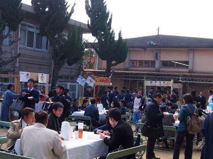 子どもたちも店番を任されており、呼び込みをしたり、作るのを手伝ったりと、楽しそうに取り組みました。そして、お越しになった先生方と中庭で、和気あいあいと料理を食べていました。