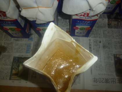 委員会メンバーは、牛乳パックに入った石鹸材料を慎重に、「良い石鹸ができますように!」