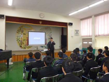 12月20日(火)6限目の道徳授業は、人権教育を全児童、生徒を対象に実施しました。講師には、大阪医科大学三島南病院の看護助手をしておられる、阿武山学園の卒業生の中川興治さんに来て頂き講演してもらいました。中川さんが26年前に卒業した頃は、学園を出てからの支援は何もなく、生活する事がとても苦しかったそうです。20歳すぎまで荒れた生活を送っている中でも、信用できる大人を見つけることができたのは、学園の中で本気で自分に接してくれた支援の先生のおかげだと話されていました。