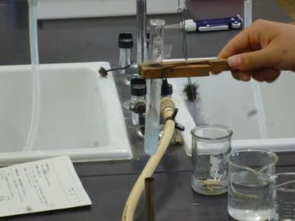 唾液と水を入れた試験管と水だけを入れた試験管を40度前後のお湯に入れることで、唾液がデンプンを分解するのか確かめる実験を行いました。生徒たちはヨウ素液の色の変化など、以前に学習した内容を思い出しながら唾液と水を入れた試験管と水だけを入れた試験管の結果の違いについて考えていました。