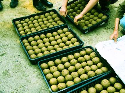 EM団子の作り方は、土を掘ってふるいにかけ、EMぼかしと発酵液を丁寧にまぜた後、ハンバーグを作る要領で空気を抜いてツルツルの団子にします。団子作りをした生徒は、綺麗に真ん丸にするのが難しいと苦戦していましたが、全部で240個もできました。乾燥するまで見守ります。白い菌糸が出てくると成功です。