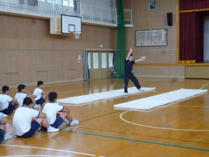 現在弘済分校の体育では、運動会前に行っていたマット運動の授業を再開しています。そして、もうすぐ実技試験として連続技のテストを実施します。そのため今回はマット運動の締めくくりとして、講師を招いての特別授業を開催しました。授業のポイントは、規定技の完成度を上げることと、技と技のスムーズなつなぎ方でした。