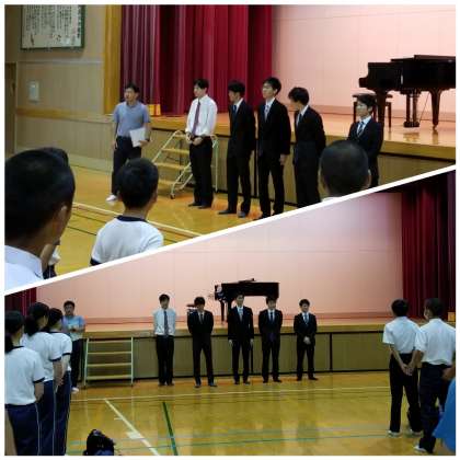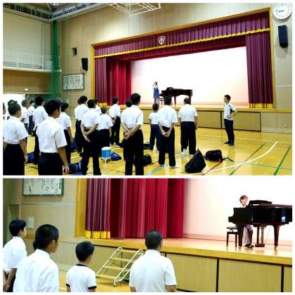 体育館で全校朝礼を行いました。音楽科の指導で発声練習を行い、恒例の学園歌を元気に歌いました。