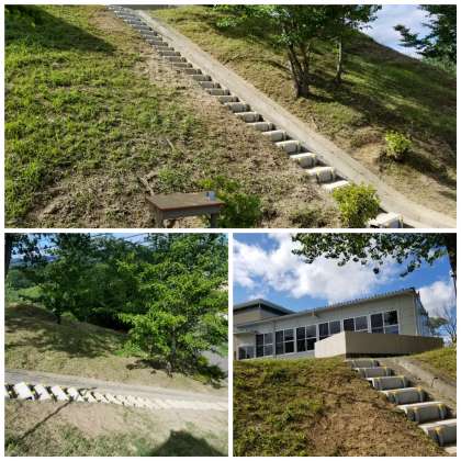 生徒の通学路途中の土手に、体育館へのショートカット。建て替えに伴い、全校朝礼を体育館で行うようになり、この階段はたいへんありがたいですね。素晴らしいものが出来上がりました。