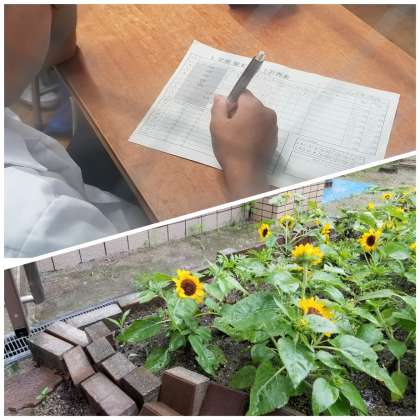 中庭の小さなひまわりが雨、風に打たれ大きく揺れています。こうやって逞しく大きく成長するのでしょうね。