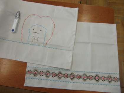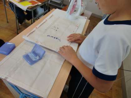 刺繍が完成した後、布をミシンで仕立ててランチョンマットに仕上げました♪アイロンで丁寧に折り目をつけてから、ゆっくり慎重に縫い進めました。手で縫うのとは違い、早くきれいに縫えるミシンを使い、便利さを実感したようです(^_-)