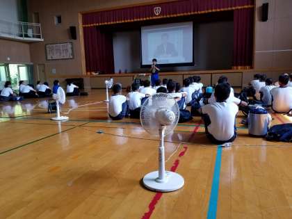 朝1限とは言え体育館の室温は高く無風です。家庭用扇風機をフル稼働させ、体感温度を下げて学習に取り組みました。