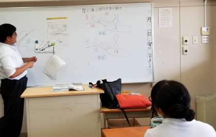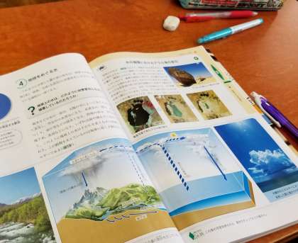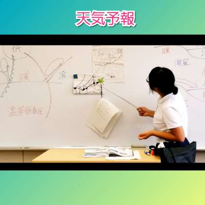 2年生女子が、 天気キャスター役に扮して 天気予報番組で自作の天気予報の原稿を読みます。