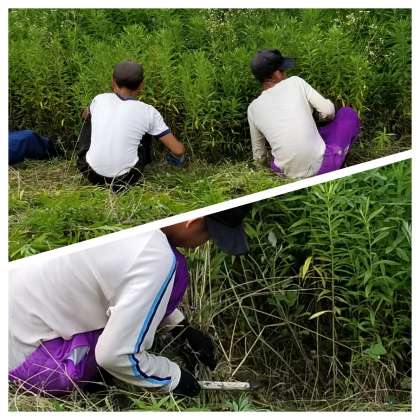1メートル前後に成長した草を鎌一つで根元から伐採します。草の中に顔を突っ込み、根元を持ち、土から2,3cmの所を鎌で切り取ります。