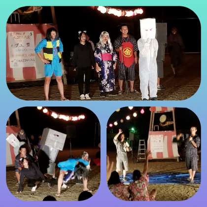 学園先生方は、ゲゲゲの妖怪楽園の妖怪に扮して楽しませてくれました。ネズミ男、目玉おやじ、砂かけばばあ、一反もめん、ぬりかべなど、普段とのギャップが大きいだけに大笑いです。