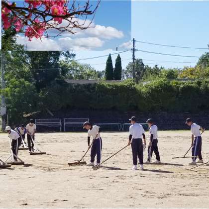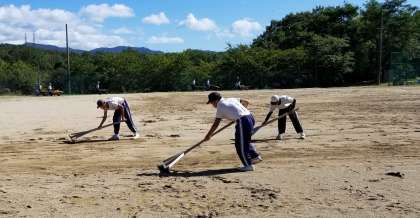 野球部が朝からグランド整地に精を出していました。昨日の雨の中活動し、ガタガタになった所をフラットにします。水捌けの良いグランドですので活動には問題ありませんが、活動場所の安全確保とグランドへの感謝の気持ちを表す行動です。