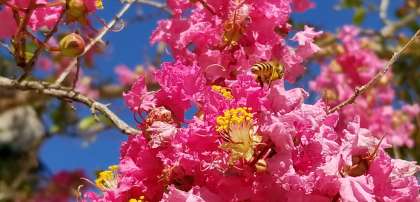 グランドの片隅に百日紅の花がきれいに咲いていました。開花する樹木が少ないこの季節、長期間きれいな花を咲かせています。そこに蜜蜂が餌を求め飛び回っています。