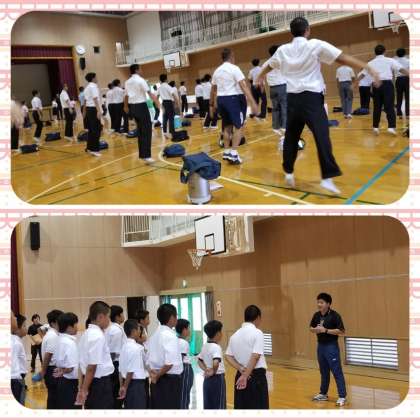 体育館で朝礼を行いラジオ体操、連絡等がありました。