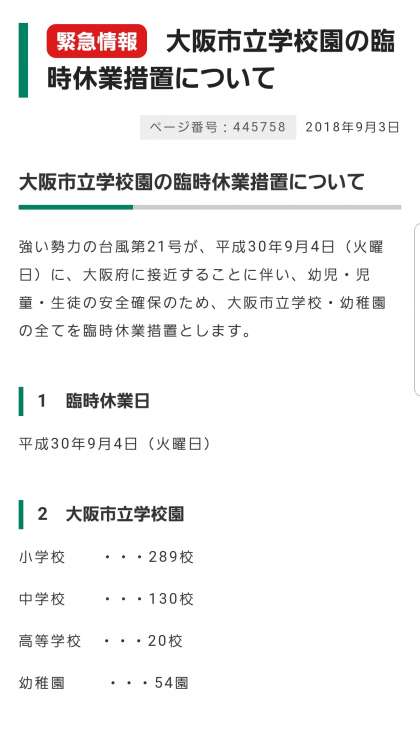 強い勢力の台風第21号が、平成30年9月4日(火曜日)に、大阪府に接近することに伴い、幼児・児童・生徒の安全確保のため、大阪市立学校・幼稚園の全てを臨時休業措置とします。