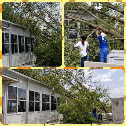 プレハブ倉庫を直撃です。屋根の鉄骨部分が折れ曲がるほどの重みです。これが寮舎や教室であったらと思うと・・・