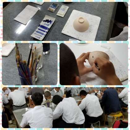 事前に学校でデザインしたものを素焼きの陶器にクレヨンや筆で絵付けしていきます。