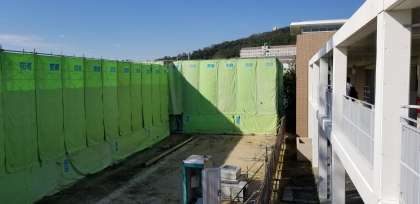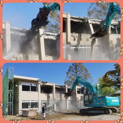 防音シートで隠された解体工事現場。一見静かそうに見えますが、その裏では旧本館が重機で砕かれています。