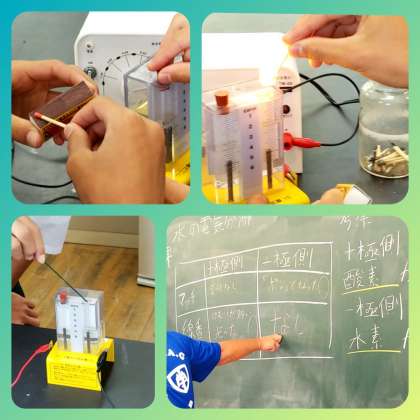 水酸化ナトリウム水溶液を電気分解装置にかけ、プラス極とマイナス極に集まった気体にそれぞれマッチの火と線香の火を近づけます。