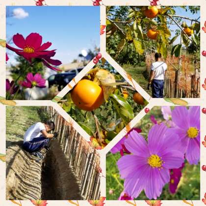 畑周囲にはコスモスの花が咲き、柿木にはたくさんの実がなっていました。