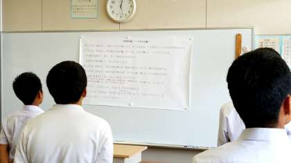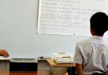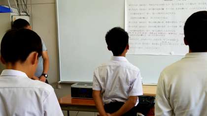 2年生の教室では、事前にカセットに吹き込まれた曲『MIDORI〜繋がる輪〜』の伴奏に合わせ歌います。ホワイトボードには拡大された歌詞が貼られいます。まだ、歌詞を覚えていないのか、前の歌詞を目で追う生徒が目立っていました。また、教室に響き渡る声にはまだまだのようですね。