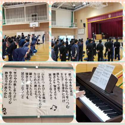 月曜日の朝礼では、全員による学園歌の斉唱です。体育館に響くしっかりした歌声です。