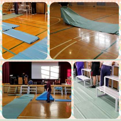 放課後、体育館では会場準備の一部が行われました。シートについては、例年雑巾がけを行いますので、今日は仮のシート引きです。