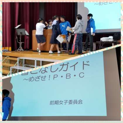 舞台では、女子委員会が前期の委員会活動について打ち合わせを行っていました。プロジェクターに映し出される映像に音声をかぶせます。生徒の正直な意見もあったりで本番が楽しみですね。